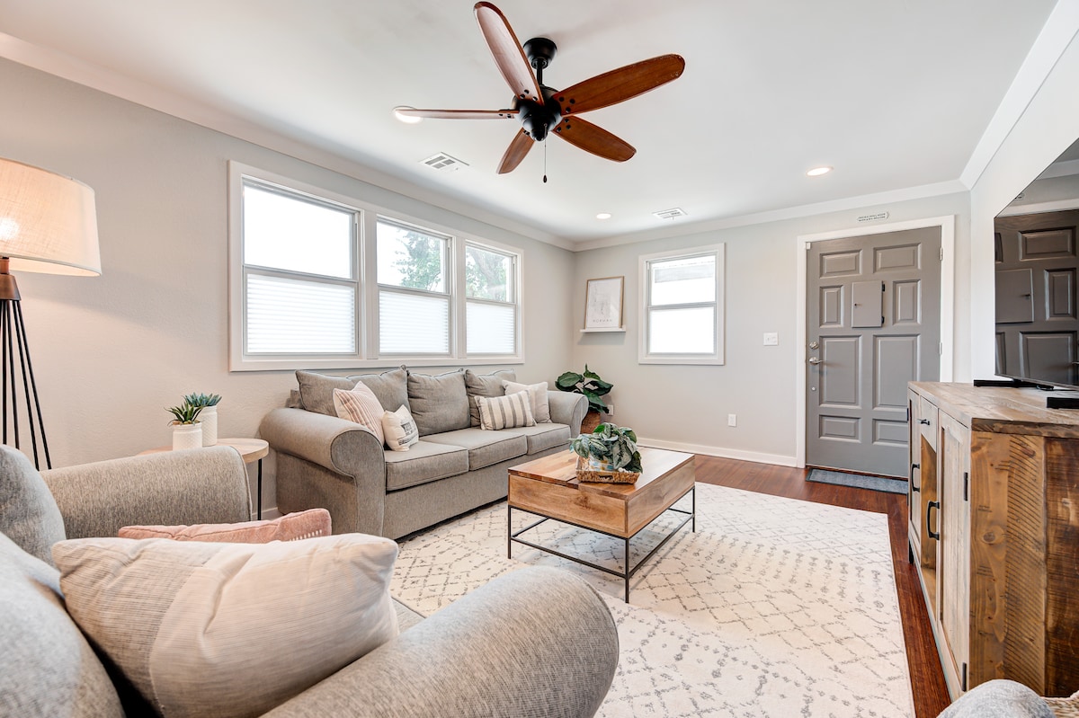 Enjoy a cozy stay at this centrally-located bungalow. A prime location between Campus Corner and Main Street makes walking to tons of amenities a breeze. Game days are a blast with a short walk (0.5 miles) to the football stadium. The layout and natural light give the home a larger feel than you might expect as the bedrooms are large, and the entertainment space runs the length of the house. With plenty of little extras like the front porch swing and covered back patio, you'll love your stay!