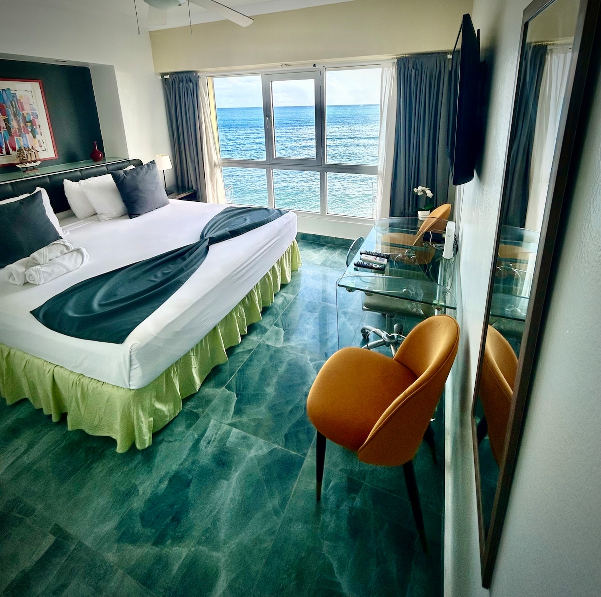 Moderno apartamento totalmente reformado en 6.º nivel con espectacular vista al MAR del dormitorio, como si estuvieras en un barco crucero , cómoda cama KING XXL. Estacionamiento privado, wifi fibra, TV, A/C, shutters eléctricos y decoración moderna. Ubicado en la mejor zona del Malecón, cerca de restaurantes y ocio. Ideal para vacaciones, trabajo o nómada digital. Estacionamiento privado, seguridad 24 horas, ascensor , edificio con generador eléctrico emergencia.