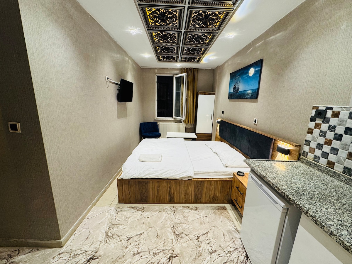 Bu sakin, şık mekânda arkanıza yaslanın ve rahatlayın. Detaylara verilen önem ve modern dokunuşlarla tasarlanmış bu özel pansiyon odamız, hem estetik hem de işlevsellik arayan misafirler için ideal bir konaklama deneyimi sunuyor. Odamızda, geniş ve konforlu bir yatakla birlikte sade ama zarif bir oturma alanı, modern çizgilere sahip bir mutfak bölümü ve gününüzü dinlendirici bir şekilde sonlandırmanıza yardımcı olacak detaylar bulunuyor. Mutfak alanında mini buzdolabı, lavabo mevcut