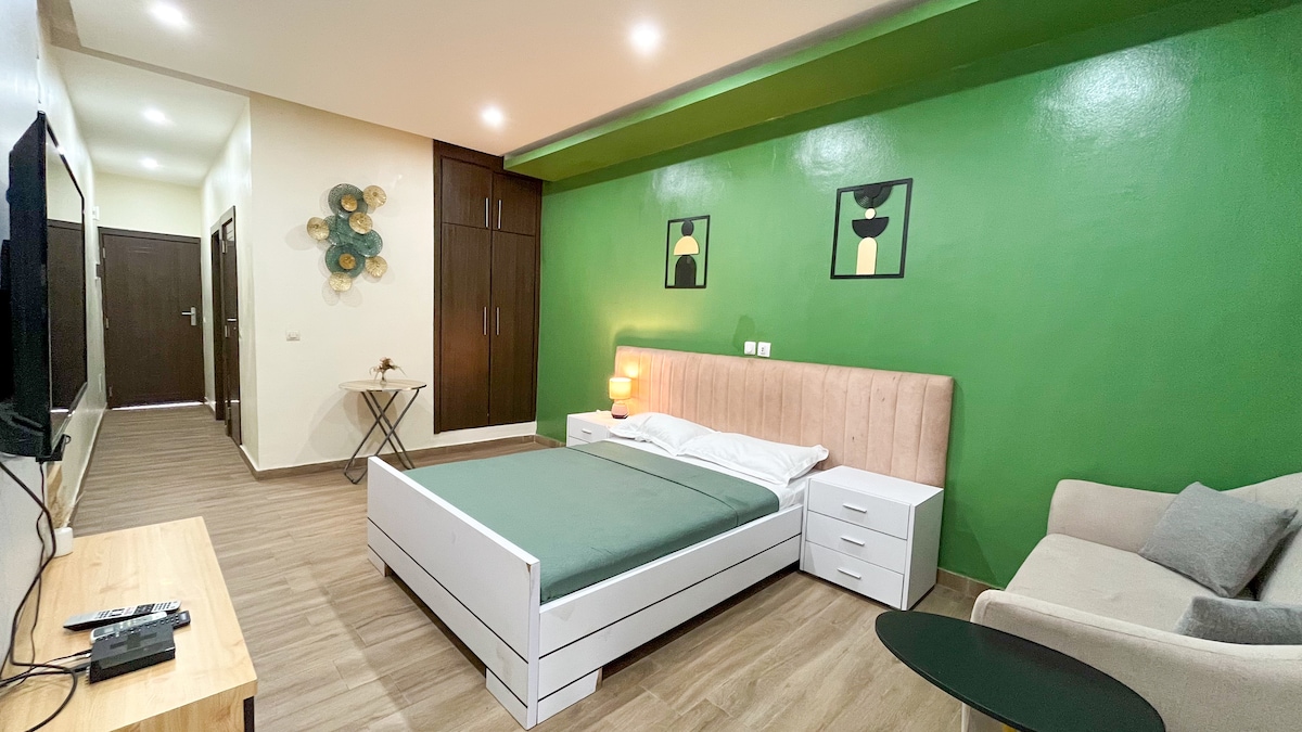 Venez découvrir notre appartement entièrement meublée et équipée, idéale pour un séjour de courte ou longue durée. ✅1 chambres avec une salle d'eau et 1 bureau ✅1 Salle à manger ✅1 Salon ✅1 Cuisine ✅1 Toilette visiteur ✅2 splits ✅ 1 Parking interne ✅service de gardiennage ✅ 1 Télévision ✅ 1 Wifi ✅1 Cuisine entièrement équipée Nous avons hâte de vous accueillir dans notre appartement et de vous offrir un séjour confortable,sécurisé et agréable à Bouaké