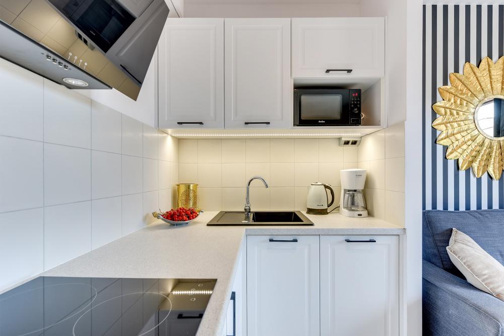 This unique premium Studio, will meet the expectations of even the most demanding guests. Perfect interiors for a romantic stay just for two as well as other occasions to spend a fantastic time in and around Gdansk. The apartment is prepared for the stay of 4 Guests because there is a sofa bed in the lounge area, from which there is also a fully equipped kitchenette and dining area. The dark but not overwhelming design sets a romantic and leisure-oriented mood.