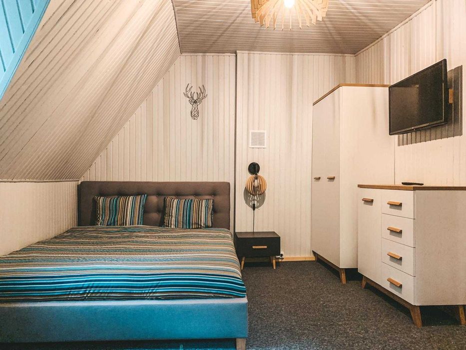 Idealny dom na pobyt dla rodziny. Na parterze znajduję się otwarty salon (z rozkładaną sofą) z kuchnią i łazienka. Na piętrze 1 sypialnia z podwójnym łóżkiem i sofą oraz 2 sypialnia z 2 pojedynczymi łóżkami. Na posesji są miejsca parkingowe ogrodzone zamykaną bramą, wydzielone miejsce na ognisko oraz wielki zadaszony taras. W domku znajduje się wiele udogodnień takich jak telewizor w salonie w pełni wyposażona kuchnia z płyta ceramiczną i zmywarką.Ideane miejsce dla wędkarzy.
