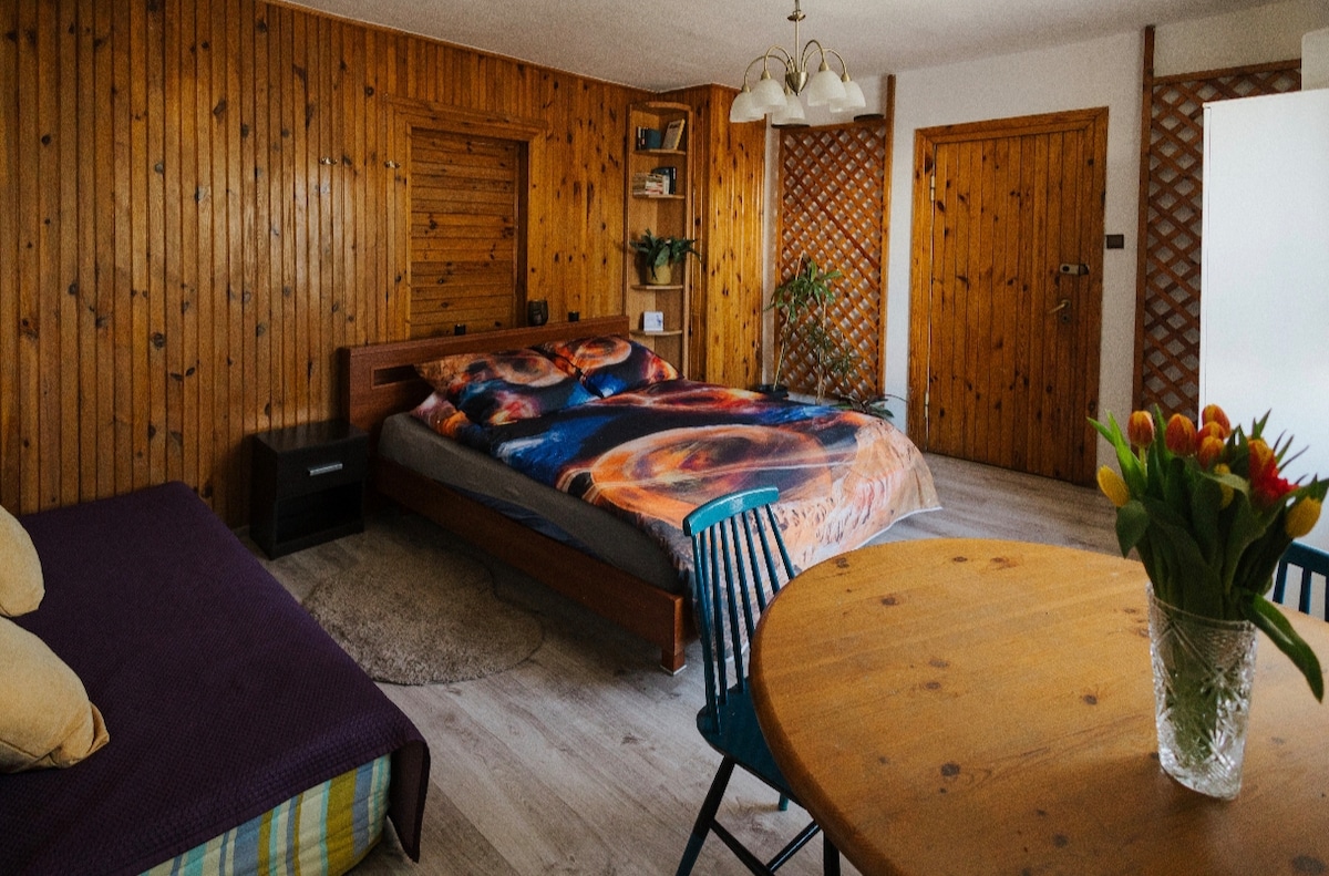 Idealne miejsce na rodzinny wypoczynek. Mieszkanie w urokliwym miejscu pod samym lasem. Lokalizacja: 15 minut od Centrum Gdańska i plaży. Udogodnienia: do dyspozycji całe mieszkanie, z dostępem do tarasu, ogrodzonego lasu, z miejscem na ognisko, domkiem na drzewie, tyrolką i leśną huśtawką. Domowe jedzenie: Na miejscu możliwość zamówienia obiadokolacji, produktów na śniadanie (domowe przetwory i świeży chleb na zakwasie) Socjale insta: koniuszewskagotuje i pod lasem