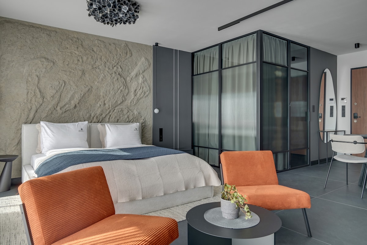 Romantic vibes and a designer freestanding bathtub are the highlights of this modern studio in Gdańsk. It’s the perfect spot for couples seeking both relaxation and style. The space combines a bedroom and living area in a minimalist, functional design. In the heart of Gdańsk, you'll find comfort, calm, and a touch of luxury—ideal for a romantic getaway or city break. On-site amenities include a gym, sauna, and rooftop terrace.