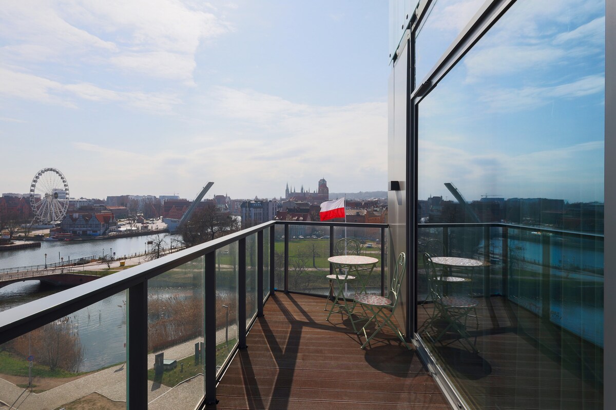 This stylish place is ideal for groups and families. Spacious apartment, 120 squaremters, 3 bedrooms, huge living area: living room, dining room and kitchen with the most beautiful view of the panorama of the Old Town Gdańsk. Guests can admire the views from both: the terrace and the windows of the apartment. We offer all the comforts, access to the fitness area and saunas, free parking space.