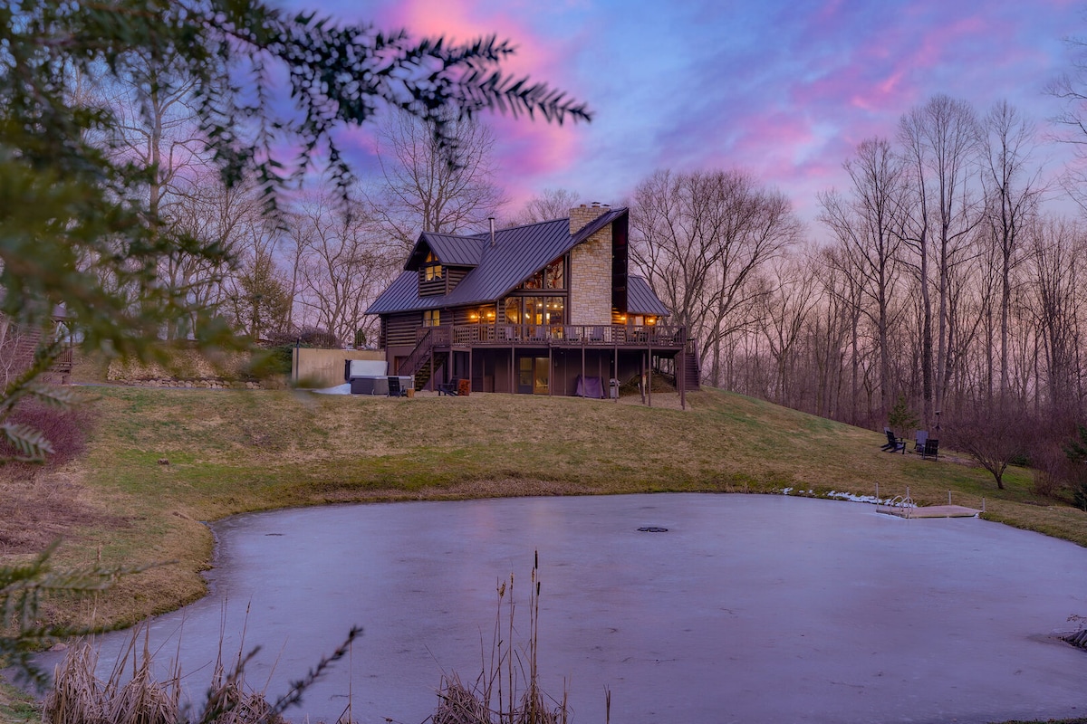 Welcome Home! 🏠 Minutes from Ohio wine country, this spacious A-frame was made for couples, family gatherings, and group escapes. Enjoy nights by the fire pit with seating for ten, sip wine by the pond, or relax in the hot tub under the stars. Inside, enjoy vaulted wood ceilings, abundant natural light, a pub-style game room, and dining space for 10. Situated on five wooded acres, our cabin blends rustic charm with modern comfort—the ultimate retreat for laughter, connection, and relaxation.