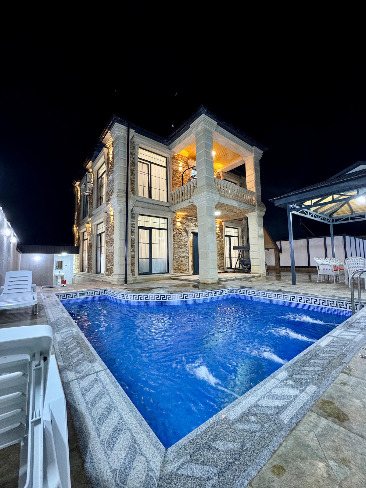 Located in Gabala city, near Gabaland Entertainment Center. House features: 3 bedrooms 2 bathrooms Comfortable beds for 6 guests 2 kitchens (indoor and outdoor) Wood-burning fireplace Amenities: Heated swimming pool Outdoor fire pit Gazebo seating area BBQ and samovar Air conditioning in every room Android TV Clean hotel-standard linens A true family-friendly home, only 60 meters from the river. Ideal for peaceful walks and relaxation.