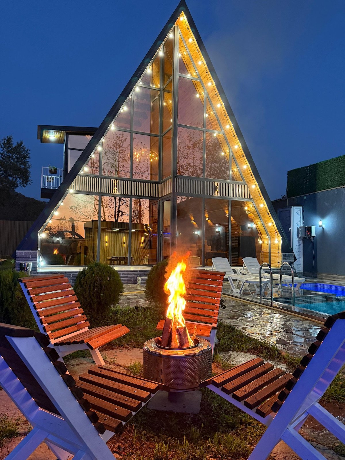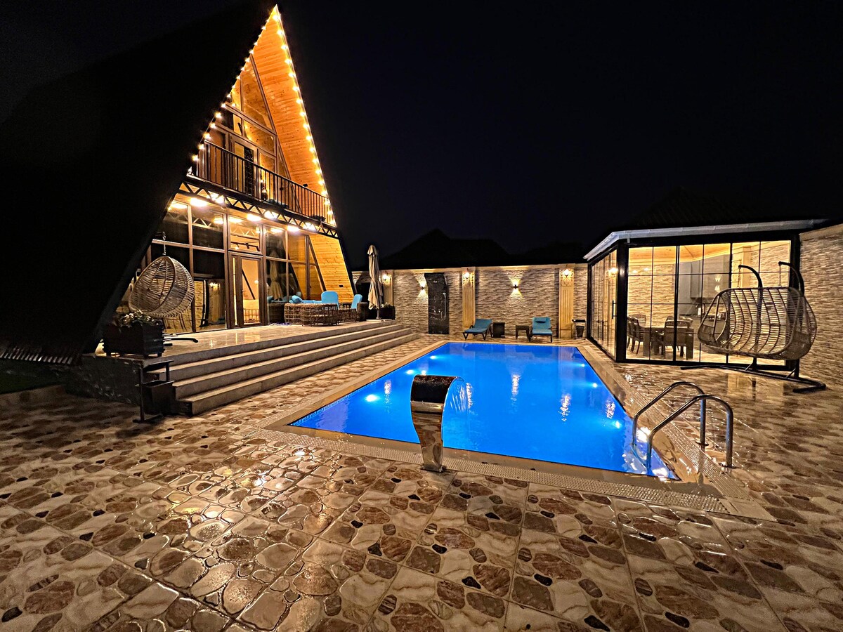Welcome to our cozy A-Frame cabin in Gabala! Ideal for families or friends, it sleeps up to 8 guests with 3 bedrooms, a spacious living room, and a sofa bed. The house includes 2 bathrooms (1 inside, 1 in the yard), free Wi-Fi, TV, and central heating. Located behind 777 Tea House on the new hospital road, with beautiful mountain views — a peaceful retreat in nature!