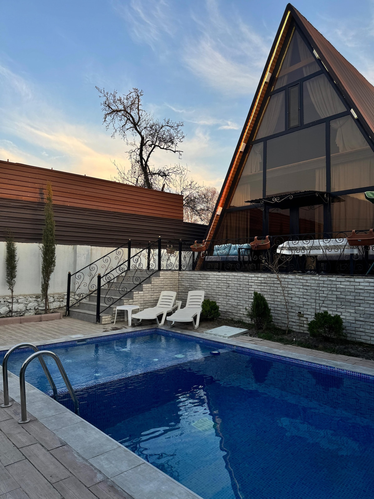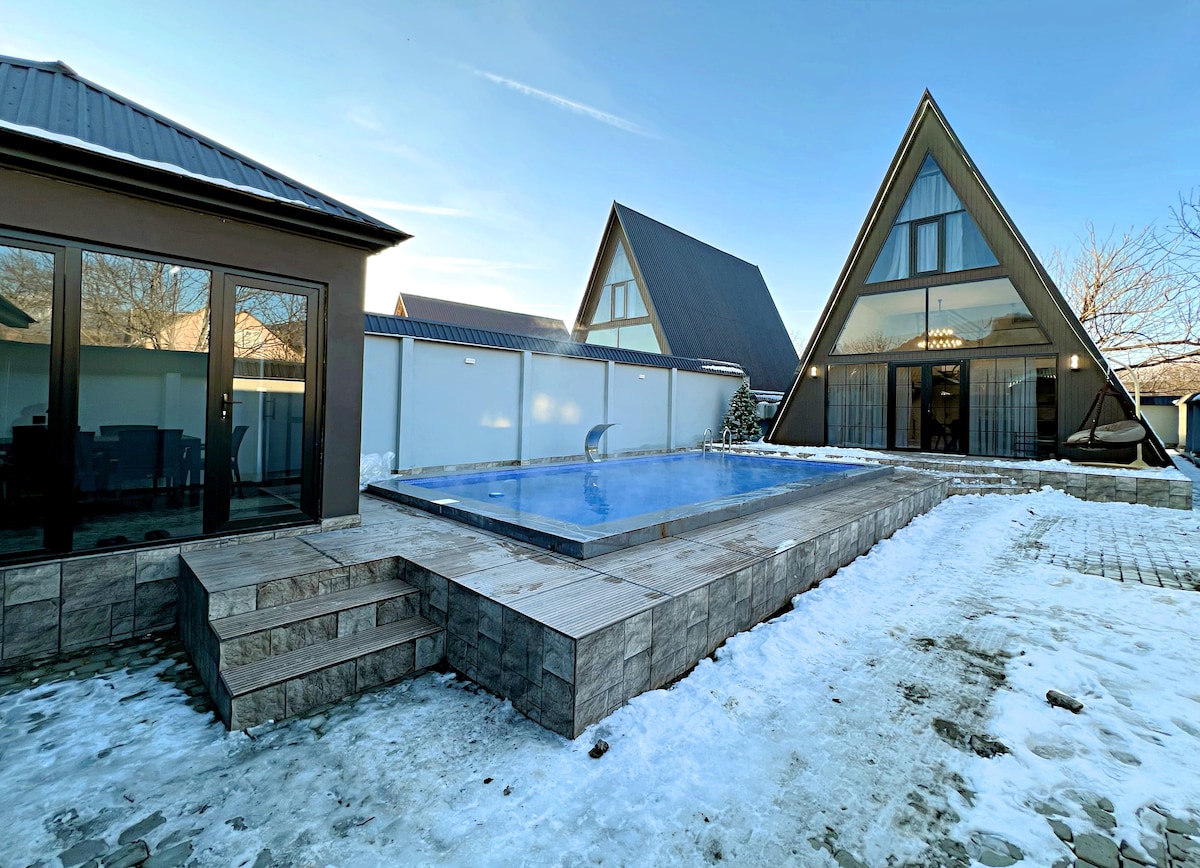 Modern A-Frame Cabin with Heated Pool in Gabala Center Located in the heart of Gabala, our elegant A-frame cabin is just a short walk from restaurants, grocery stores, pharmacies, and entertainment venues. The house features a heated pool and is furnished with high-quality furniture for your comfort. Enjoy the beautiful mountain view through the large panoramic windows, and feel the sense of spaciousness created by the high ceilings. Comfort, style, and nature — all in one place.