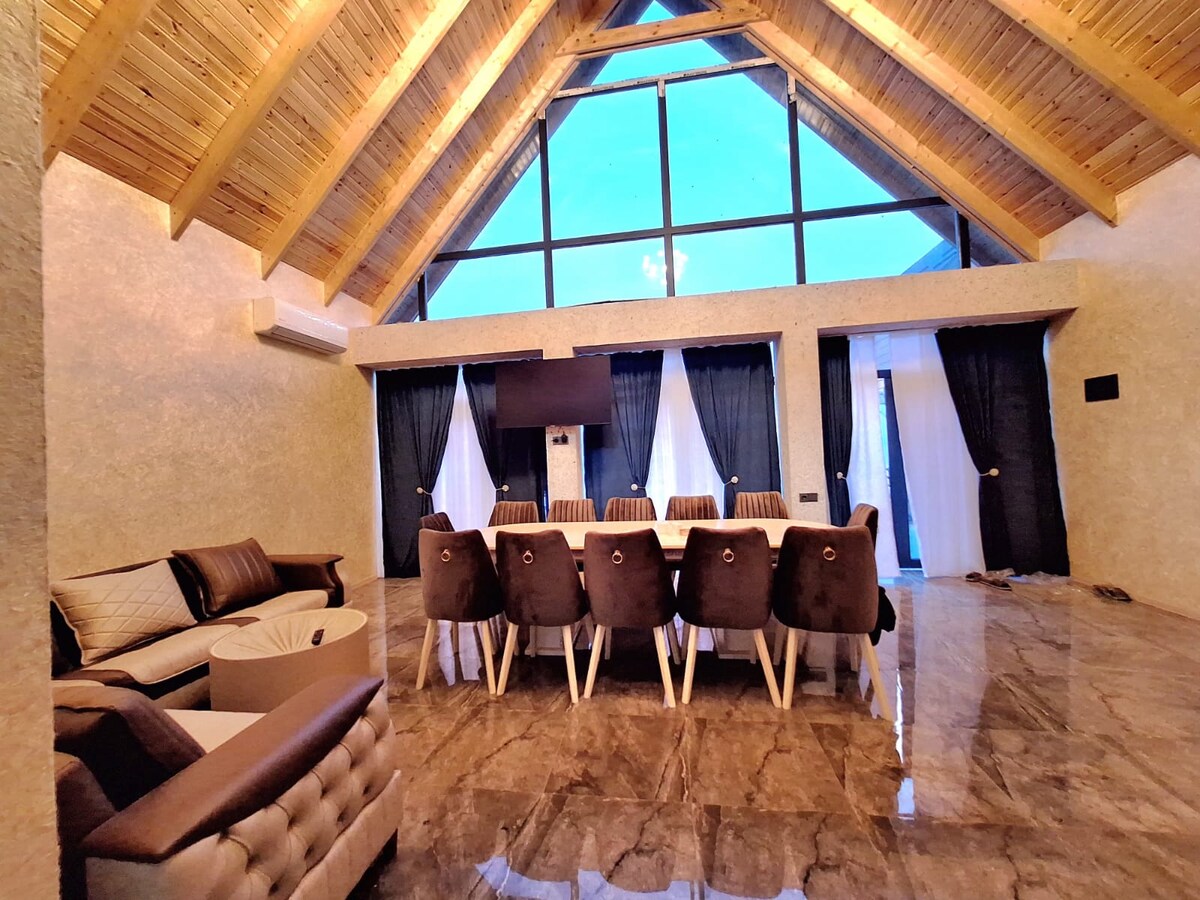 Bu rahat qalmağa yerdə bütün ailəniz ilə birlikdə dincəlin.A frame villamiz çox geniş ,səliqəli ,qapalı hovuz,caqquzi,sauna,restoranlar yanında,market yanında,kanat, Tufandag,lunaparka ən yaxın məsafədə yerləşir,evdə manqal,samavar var,