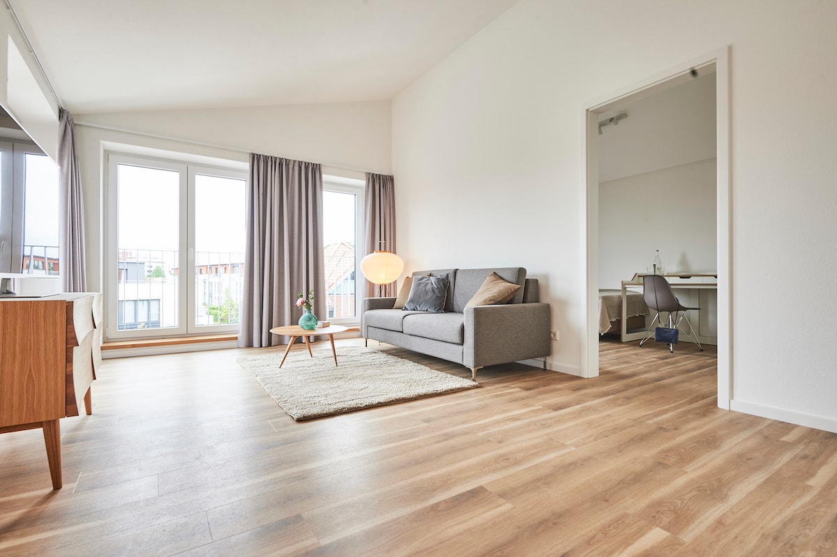Welcome to CABANA Apartments in the centre of Oldenburg. You have 98m2 at your disposal in this maisonette flat, which is located on the 6th and 5th floor directly in the city centre. Here you live within walking distance of the pedestrian zone → Completely renovated → 1 bedroom with king-size bed and murphy bed → 1 sofa bed (living room) → View → Smart TV with NETFLIX → Capsule coffee / tea → Fully equipped kitchen → Balcony → Parking space available ☆"Highly recommended! We will be back!"☆