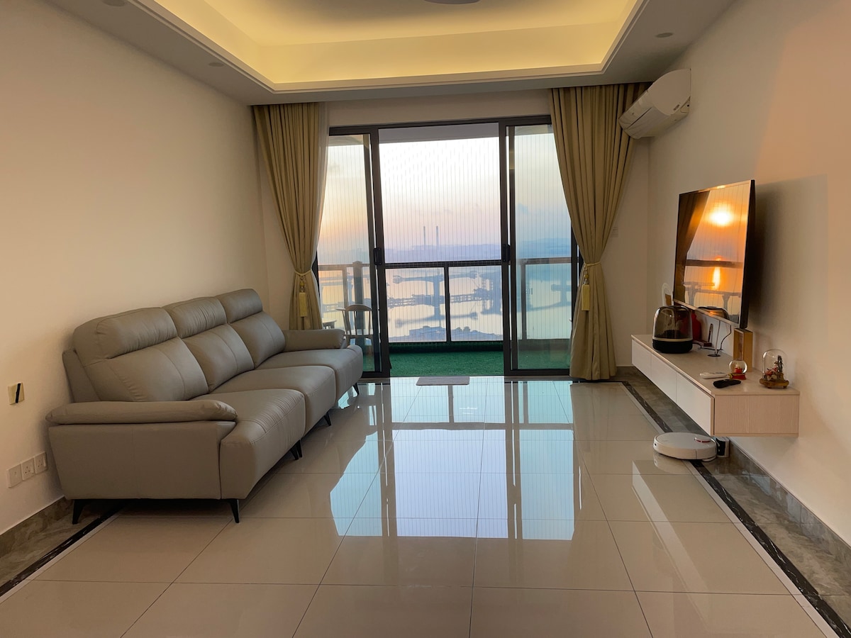 Our Minimalist home is your ideal tranquil heaven. Escape from the daily hustle and bustle, immerse yourself in the tranquil cosy comforts. The beautiful high floor Seaview and it's great location are suitable for couple and whole family who seeking for a get away trip. Only 5mins away frm Sg. 3-5 mins walk to Familymart, Starbucks, Restaurant, Movie theatre Sunway Big Box Retail Park, X Park and etc. 8 Mins drive to Legoland. Relax with the whole family at this peaceful place to stay.