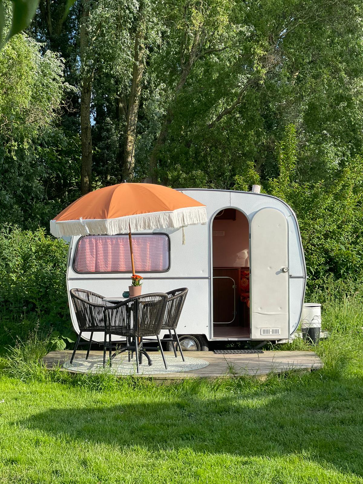Deze prachtige vintage caravan, staat op een groot stuk tuin. Als kampeerder ervaar je echt de rust en de ruimte. Het stuk weide van 150*100 deel je slechts met 2 andere kampeer plekken. Het is een grasland met fruitbomen en omheind door bomen en een haag. In de tuin is een natuurlijke zwemvijver aanwezig om in te zwemmen. Het is een caravan uit 1974. De caravan is in no-time verwarmd met het aanwezige kacheltje. De toilet/douche ruimte is op 50 meter afstand.