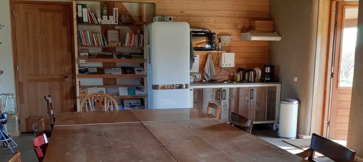 Een sfeervol 2-4 persoons houten huisje aan de rand van het dorp. Mooie natuurlijke omgeving met uitzicht over de weilanden en kleine boerderijdieren. Niet koken wel eventueel opwarmen in de magnetron. Koffie en thee faciliteiten gratis aanwezig. Ontbijt is mogelijk tegen meerprijs. Gewone fietsen(2stuks) mag u lenen.