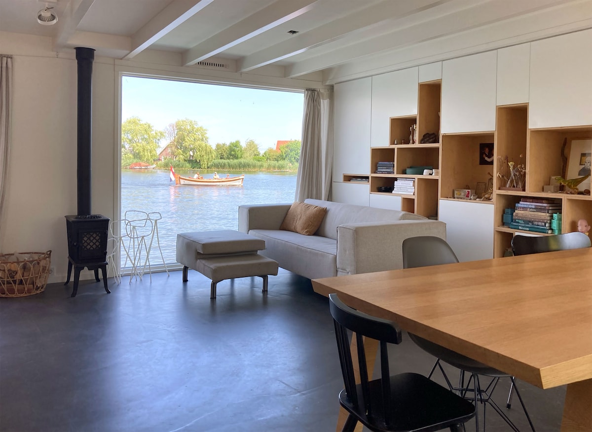House boat at the edge of Amsterdam. Explore city life of Amsterdam and relax in one visit. Dive into the river directly from the master bedroom. See waterbirds while you wake up drinking your coffee. FREE PARKING next to the house and free P&R at the closest station. A 15 minute ride to the centre of Amsterdam. The house boat is located between romantic old Dutch villages where you can dine next to the docks and see ships roll by.