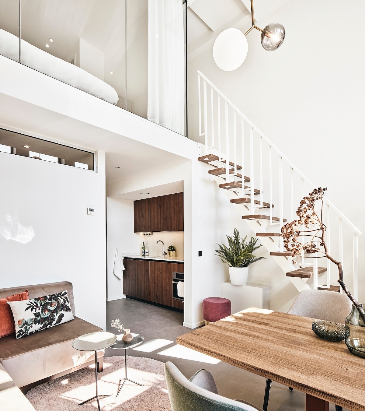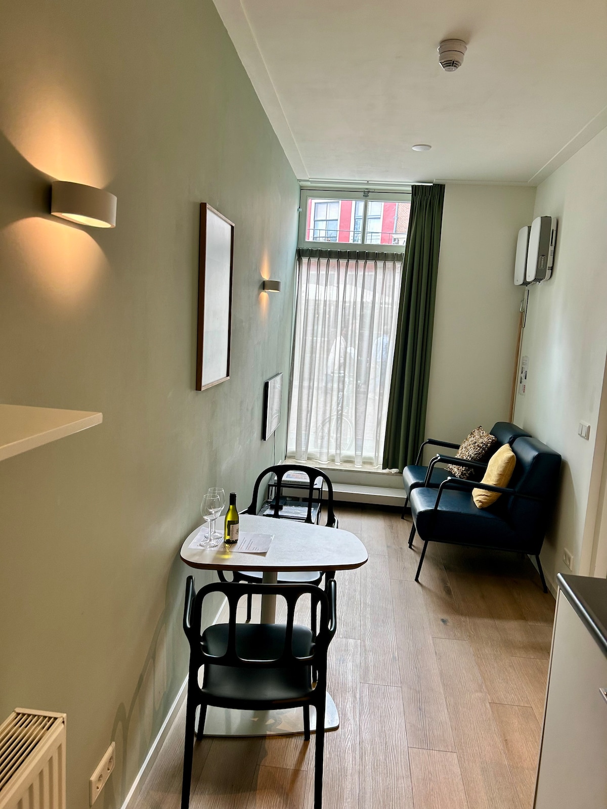 This studio with 1 double and 1 single bed is over 30 m2 and has glass on 3 sides and therefore has a beautiful view over the water and the city of Utrecht and is equipped with all the luxury and convenience for the young professional. In addition to the luxurious kitchen and bathroom, there is a separate table with 2 comfortable chairs for working and eating. Many outlets are equipped with a USB connection so that charging of electronic devices is possible anywhere in the studio. The modern 2 person box-spring bed has a built-in adjustable color lighting in the headboard so that you can determine your own atmosphere in the room.