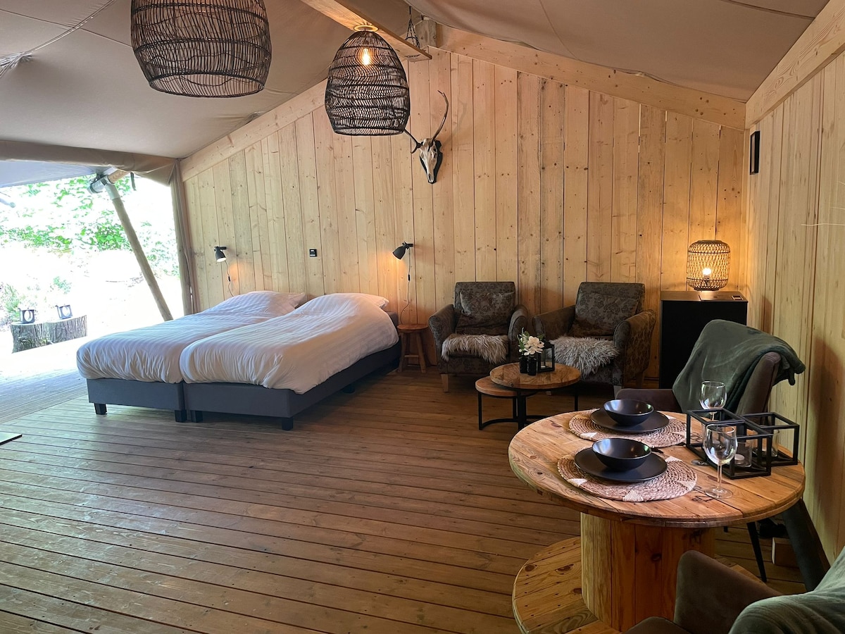 De Veluwse Safari Lodge tent is gelegen aan de voet van het planken wambuis gebied. Geniet van de luxe die deze tent biedt! Eigen badkamer met toilet en douche , gezellige zithoek met palletkachel, ingerichte keuken en heerlijke bedden. Ook buiten is een fijne zithoek, picknicktafel en 2 ligbedden. Geniet van het ontwaken met de vogels, de rust en natuur. (Elektrische) fietsen zijn te huur en om het compleet te maken is er ook een jacuzzi te huur
