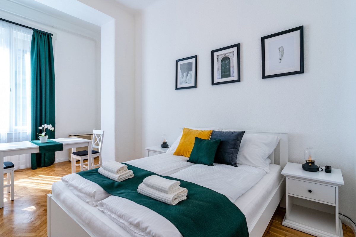 Contemporary designed suite of top quality is waiting for you in the very heart of Budapest - a short walking distance from most sights - and also perfectly connected with public transport. Our apartment has two double beds and can comfortably host 4 guests. We offer all the essentials: sheets, towels, fast Wifi, two AirCos, TV set, coffee machine, bluetooth speaker - and more: Book with us to receive our self-written Budapest guide packed with recommendations to make the most of your trip :-)