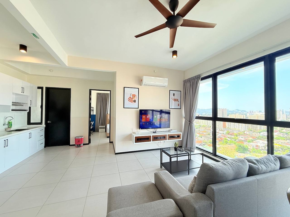 Urban Suites by Comfy Homestay ★ 5 stars SUPERHOST ★ House level 25 ★ 3 Bedrooms with 2 toilets (City View) ★ 1 private car park at level 10 ★ 100Mbps high speed WiFi ★ 2 min drive to Penang Bridge ★ 2 min drive to Karpal Singh Drive cafe and pubs area (Starbucks, Coffee Bean, McD, Family Mart, Karpal Singh Drive Seaview Promenade) ★ 5 minutes drive to Queensbay Mall ★ 8 to 10 min drive (less than 5km) to Chew Jetty, Street art & UNESCO Heritage old town. ★ 25 min drive to airport