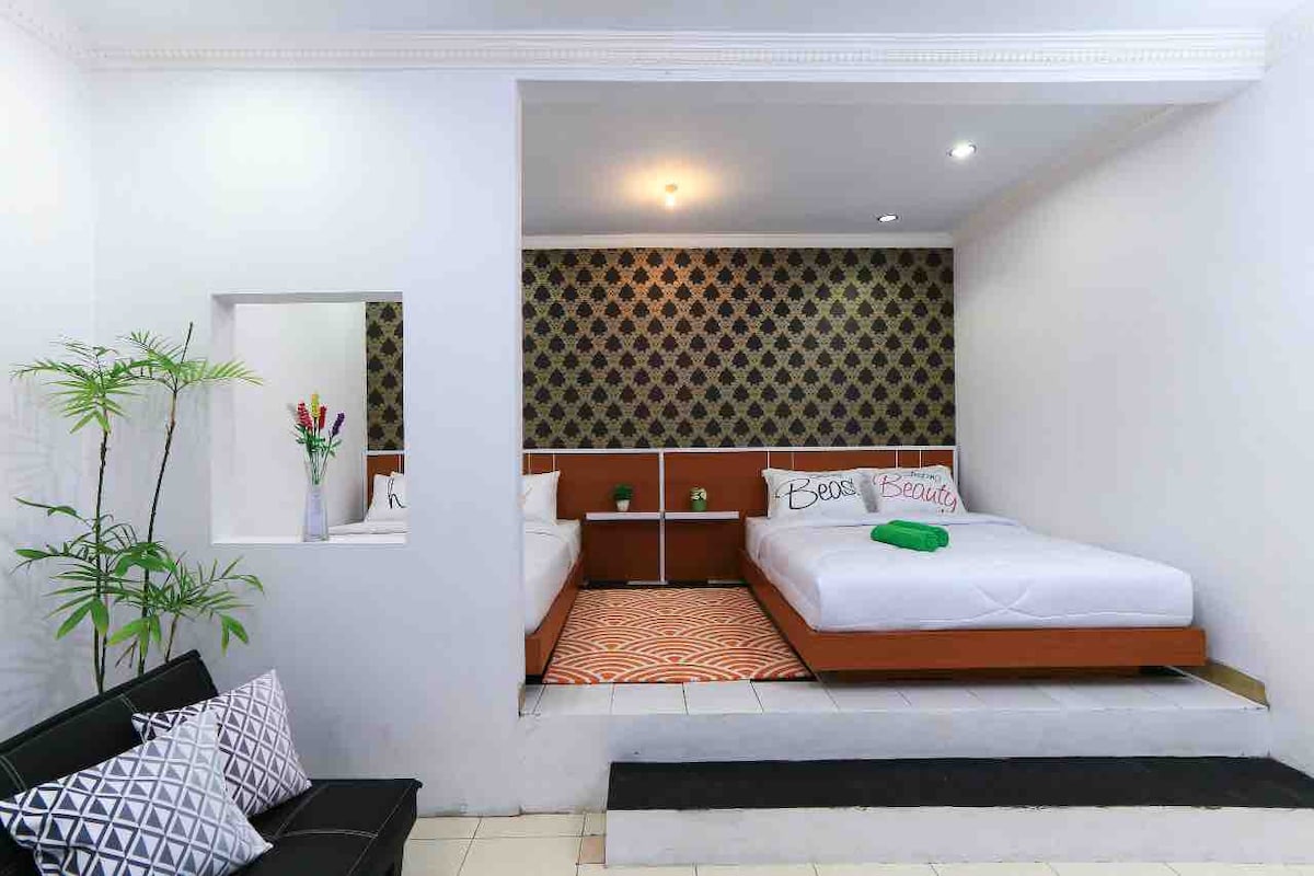 Relax with the whole family at this peaceful place to stay..... strategic location inner ringroad, 5km from Malioboro. 2 bedrooms accomodate 4 people (up to 6), full AC, free wifi. 2 bathrooms with waterheater. Simple kitchen set and refrigerator. 2 Smart TV, Free parking for a car. Enjoy stay with reasonable price. Free simple traditional breakfast by request for one day, (Kami menyediakan 2 kamar tidur dgn 2 kamar mandi dgn waterheater. 1 R keluarga, 1 dapur. Full AC. Bebas parkir...)