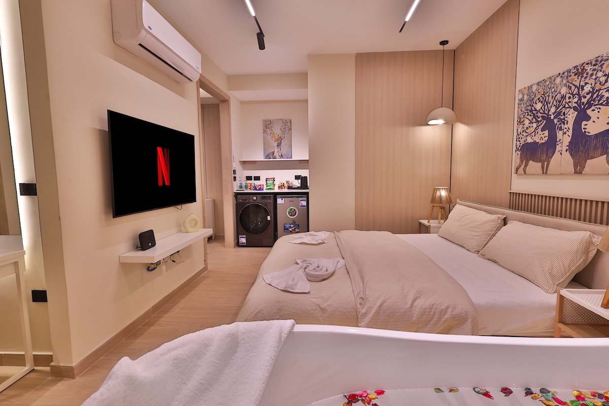 Experience modern boho luxury in this brand-new (Oct 2025) apartment located in the prestigious West Golf Extension, New Cairo — just minutes from 5A Walkway, Cairo Festival Mall, and Katameya’s vibrant spots. Enjoy presidential master bedroom, 4 Smart TVs, concealed A/C, electric shutters, and all-new appliances in a bright, elegant space. Perfect for guests seeking comfort, style, and an upscale Cairo experience.