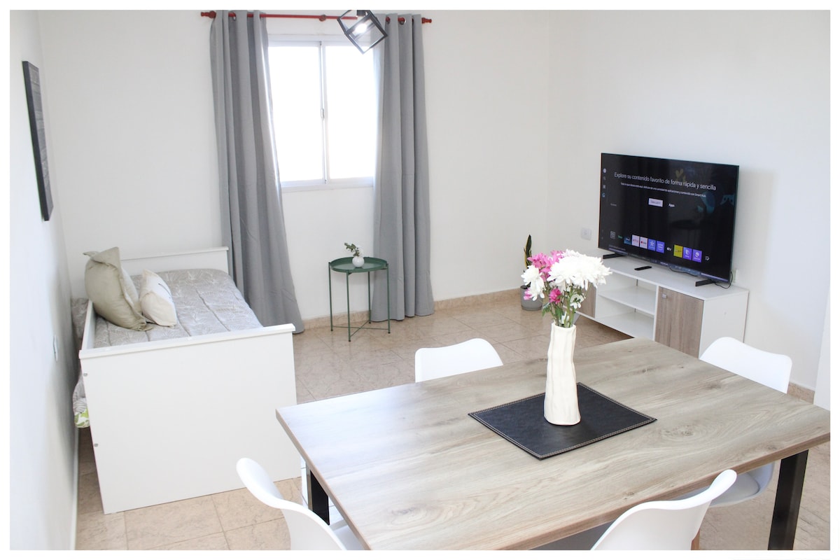 Amplio, cálido y luminoso departamento en primer piso por escalera, con balcón a la calle. Estar-comedor y cocina completa integrada, baño y un dormitorio. Tiene una vista hermosa a un espacio verde muy arbolado.
