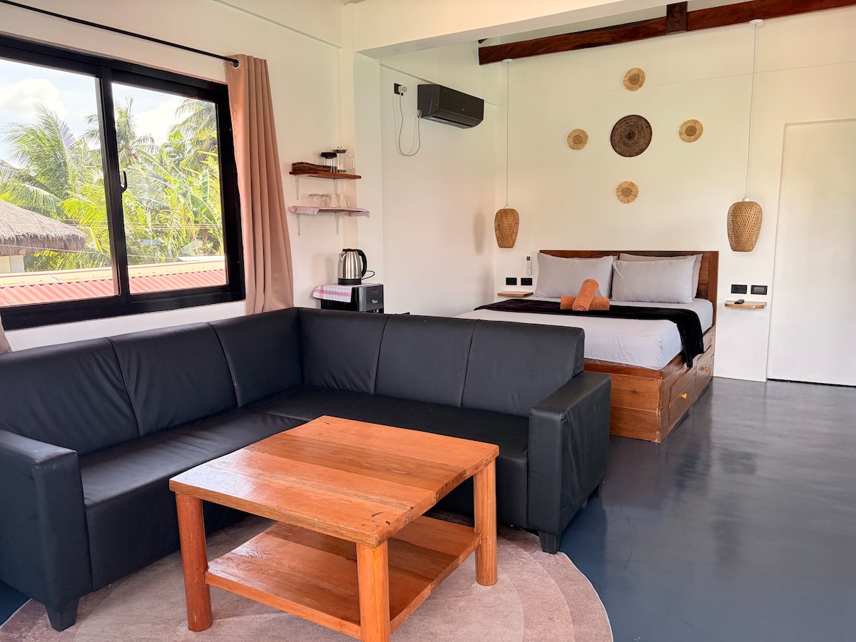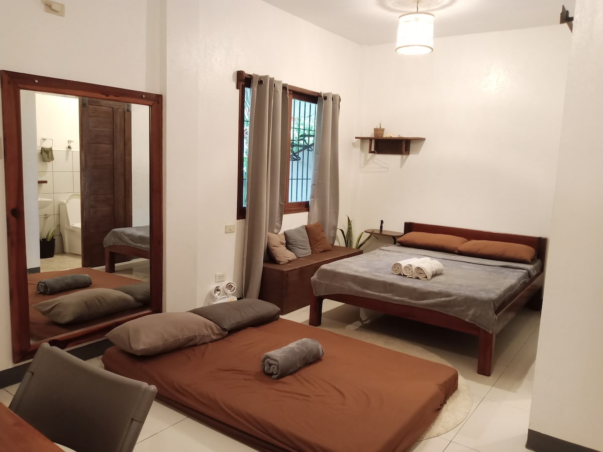 Strict quiet hours (9 PM–7 AM). Max one visitor. No balcony use during quiet hours. Located in a quieter part of downtown General Luna, away from bars yet walking distance to restaurants and essentials. Set in a gated, family and pet-friendly compound. Fully self-contained with private kitchenette, large fridge, cooking/dining essentials, storage, TV, hot shower, A/C, covered balcony/patio, and fast fiber internet. Ideal for peaceful stays, not late-night gatherings.