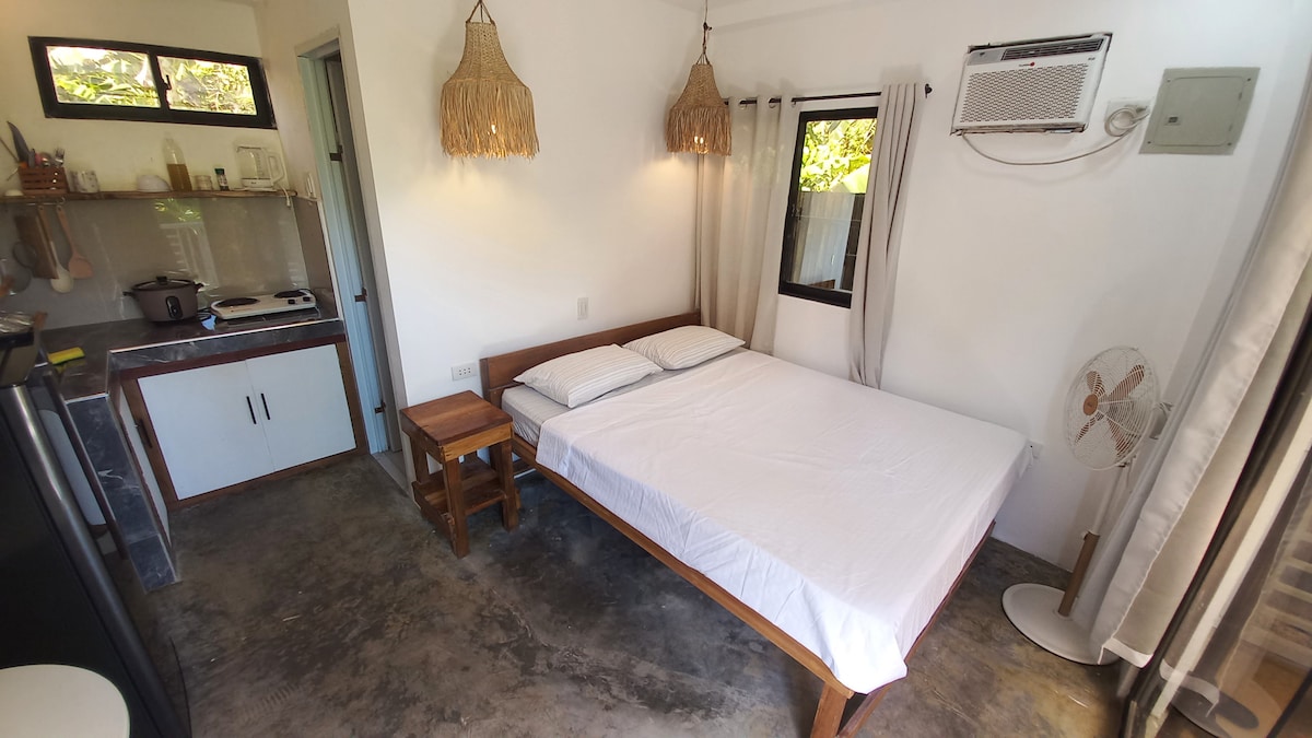 Enjoy modern comfort and design with an island touch in this fully equipped studio apartment: -Split-type air-conditioning -Thick queen-sized bed -Equipped kitchen -Working desk -Starlink Wifi -Large private patio with dining table -Private bathroom with hot water shower -Back-up Generator -Access to a big lush tropical garden -Gated property -Free parking upon request -Malinao white sand beach at 5min walk -Little grocery stores at walking distance -Carinderia restaurant at walking distance.