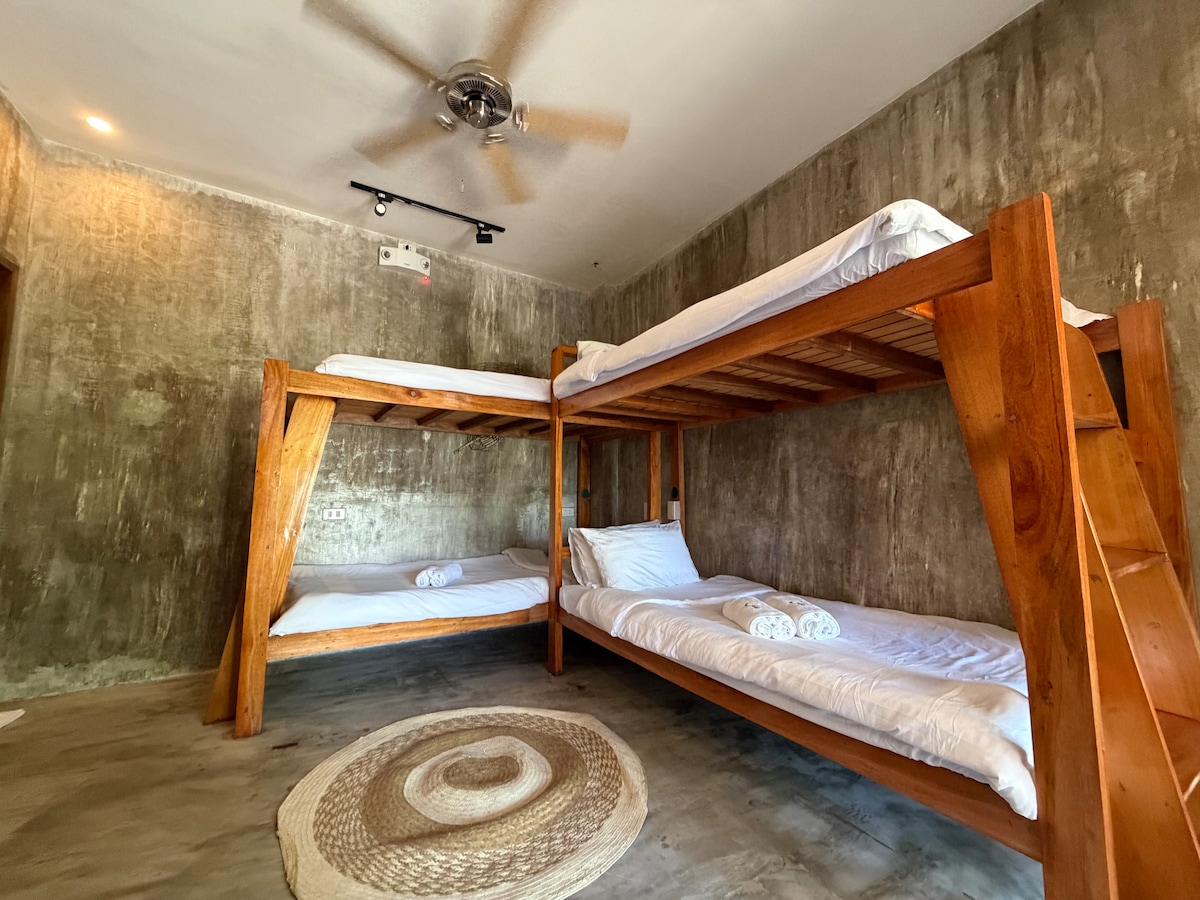 Stay in our family 6-bed dorm, perfect for families and groups. Each bed has privacy curtains, outlets, and comfy linens. Guests enjoy A/C, fast WiFi, pool access, and a welcoming vibe. Located in the heart of Siargao, steps from restaurants, surf spots, and nightlife, with 24/7 reception and security. A peaceful, friendly space where families and groups can feel at home.