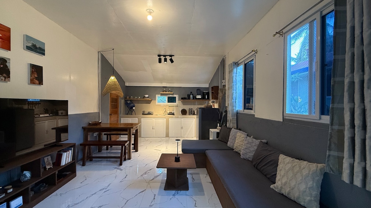 Welcome to our Island Home! Located in the heart of General Luna, This Solar powered listing offers a large fully furnished super deluxe studio! Our home is equipped with a large solar power system and battery backup, ensuring you have a reliable and comfortable stay even during Siargao’s common power outages. This Large solar system will provide you full access to everything! Air Conditioning, Starlink, water supply, water heater, lights, fans, power outlet’s, kitchen appliances!