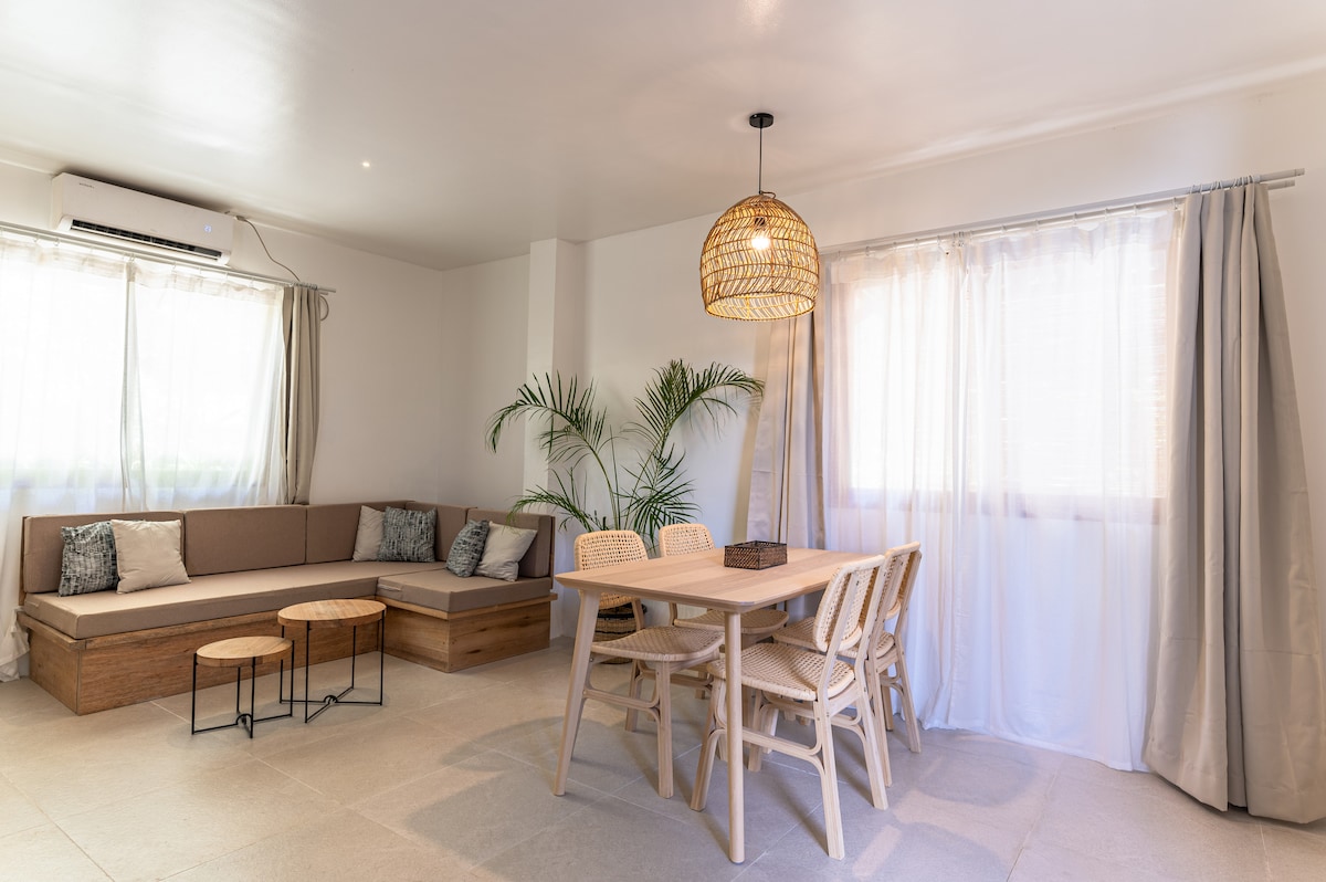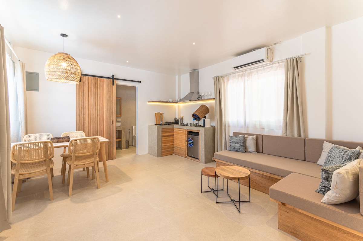 Comfortable island living. Three large ensuite bedrooms with King size beds and soft pillowy mattresses. An open plan kitchen, living and dining space with a 55inch TV and a Mi smart speaker. Starlink WiFi w speeds up to 200mbps. Big bright bathrooms with hot water and good water pressure. Scooters available for rent upon request. Extremely well located but feels secluded and private. Walking distance to the beach, best restos and cafes.