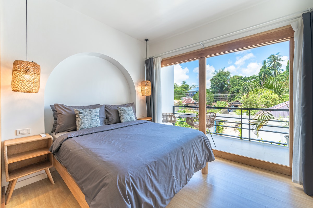 Brand new apartment ideal for digital nomads. located in a peaceful yet central residential area - within 10 minutes walk to Cloud 9 and AFAM bridge, and 10 minutes by tricycle into the heart of General Luna. The room has a queen bed with comfy mattress and duvet, fast Starlink WiFi, Smart TV, AC, large bathroom with hot shower, kitchen with utensils, fridge, working desk and office chair, and private veranda. We have two units available, this listing is for the upstairs room (first floor).