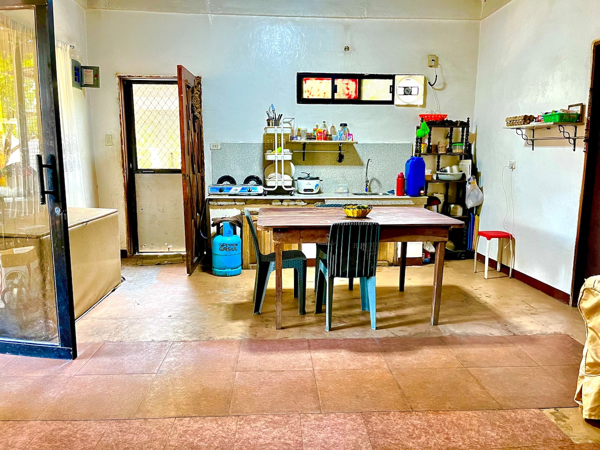 Cozy studio across from the plaza with barn-style doors and windows. Includes a double bed, cabinet, shelf, and clothes rack. Stay cool with A/C or a fan, if you wish to let fresh air in. Kitchenette has fridge, stove, kettle, rice cooker, pot, pan, and dining essentials. Complimentary mineral drinking water for your stay. Ensuite bath with niches. Shampoo and body wash are provided. Enjoy a private outdoor dining nook, laundry area, and side parking. Sari-sari stores nearby for essentials.