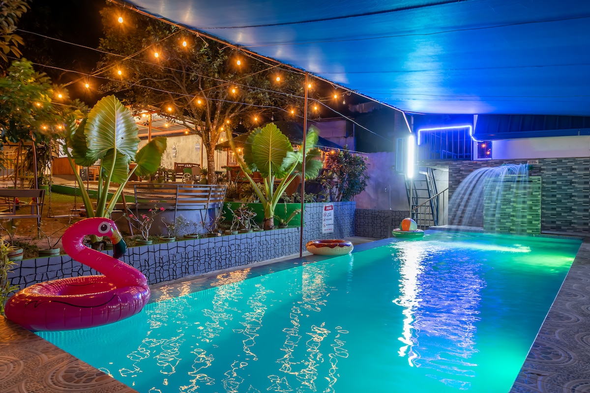☻ Rooms → 3 Rooms (2 Queen size Bed, 2 Full Double Bed) → Main Bedroom has home Screen Movie Projector → Fully Air-conditioned → Ceiling Fan ☻ Living Room → Sofa → Smart TV → 200Mbps Wifi → Round Table → Speaker → Boardgames ☻ Outdoor Dining & Kitchen → Fully Equipped Kitchen → Outdoor Cooking → Outdoor Lounge Area ☻ Outdoor Area → Pickleball Court (Not a professional one, good for dinking) → 4 ft dipping pool → Bonfire → Tables and Chairs → Camping Chairs → Griller → Private Parking