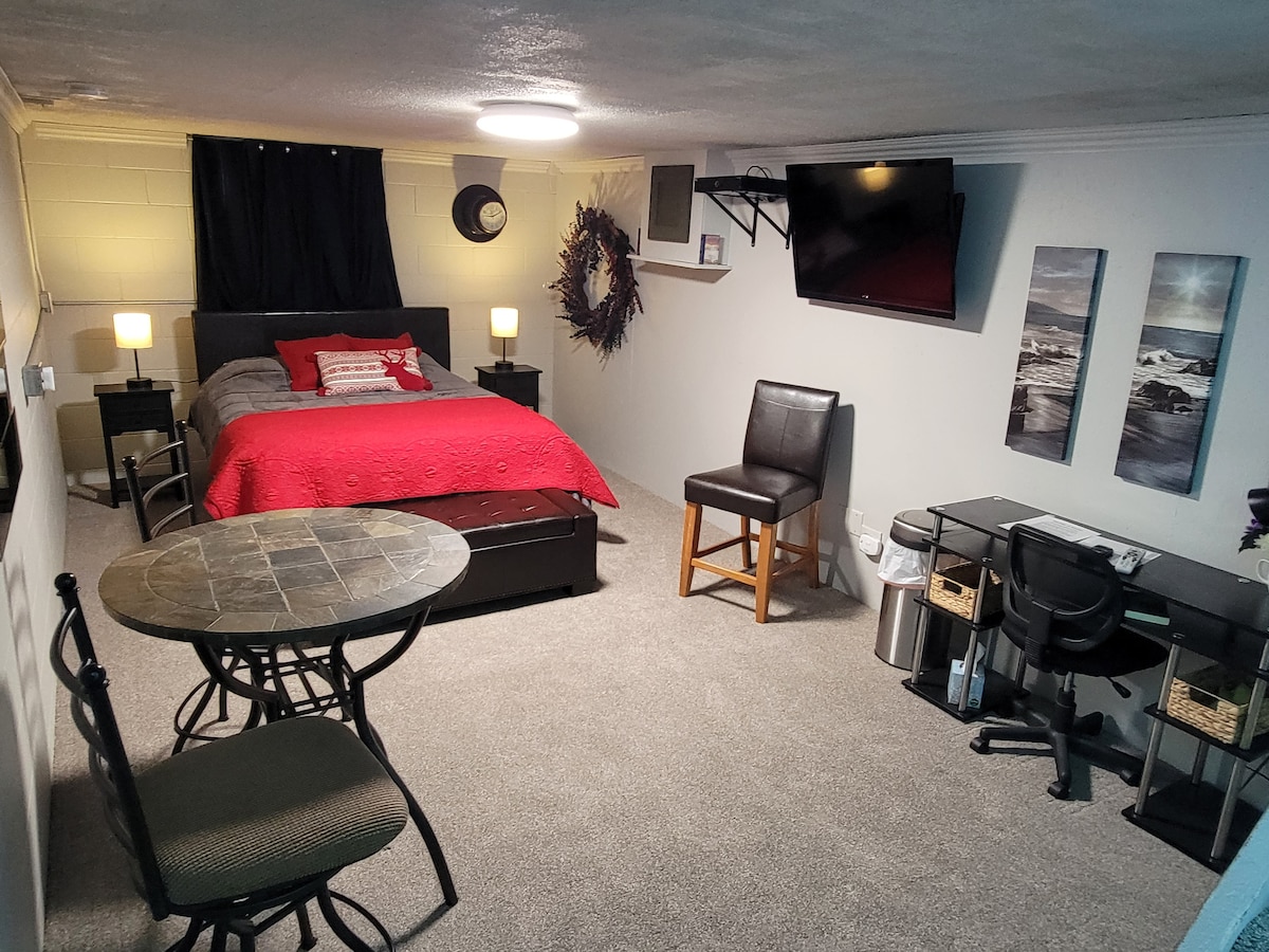 Now dog friendly! Relax in your own quiet, comfortable guest suite. This lower level private space has a keyless entry for self check-in and is accessible by a set of stairs adjacent to your dedicated parking spot. The comfortable bedroom has a queen sized bed. A kitchenette and generous sized living area offer everything you may need for a comfortable stay. Unwind on our new secluded patio. Take advantage of the inviting hot tub, ideal for a relaxing evening.