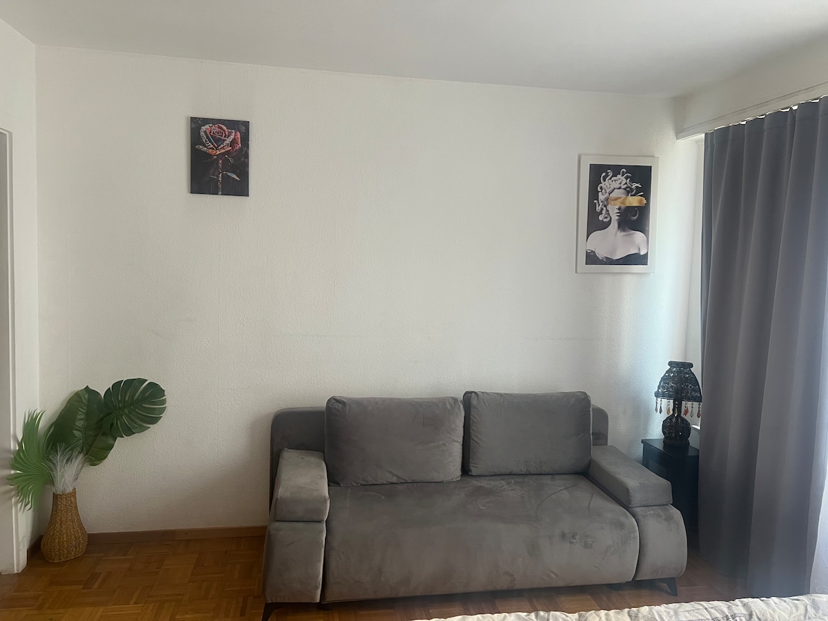 Nice studio apartment in a very quite area & building and very close to the main train station and 10 mins walk to the lake! 2 pieces luminous apartment on the 2nd floor, very quiet during day and night, neighbors are friendly and well mannered. Spacious kitchen with fridge, oven, microwave and a big table to sit 4 people. The room is fully equipped with a big double bed, a big L shape canape, a big flat screen TV with access to many Swiss & International channels. Wifi is free and fast.