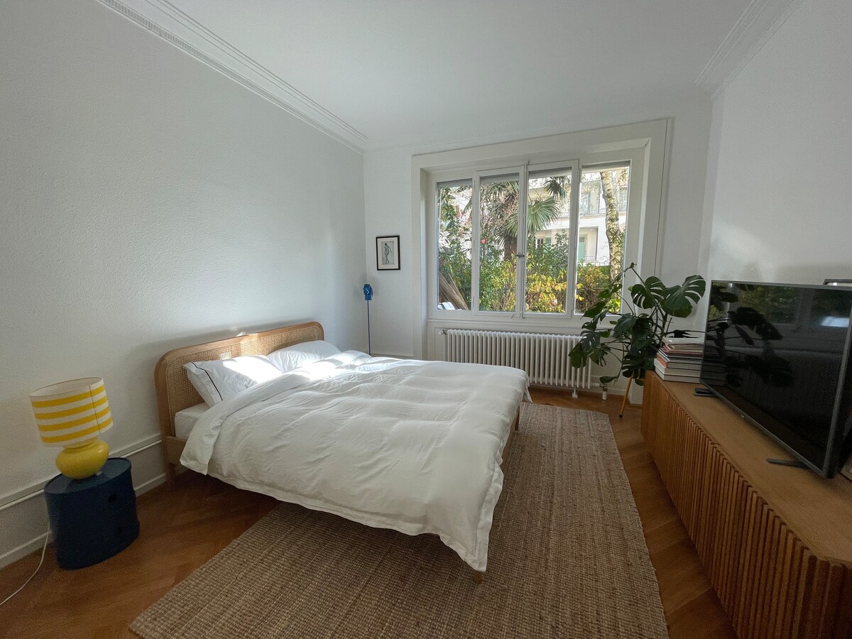 **Monthly discounts available! Can contact to help fit your budget.** Beautiful and Spacious newly renovated 2-bedroom apartment in Geneva. Central Geneva, just an 8-minute walk to train station and direct bus to the airport (20 mins). Size: 4 room apartment with 2 bedrooms, kitchen, bathroom(shower/toilet are separated) and living room(~100m2). Also a small balcony and elevator in building.