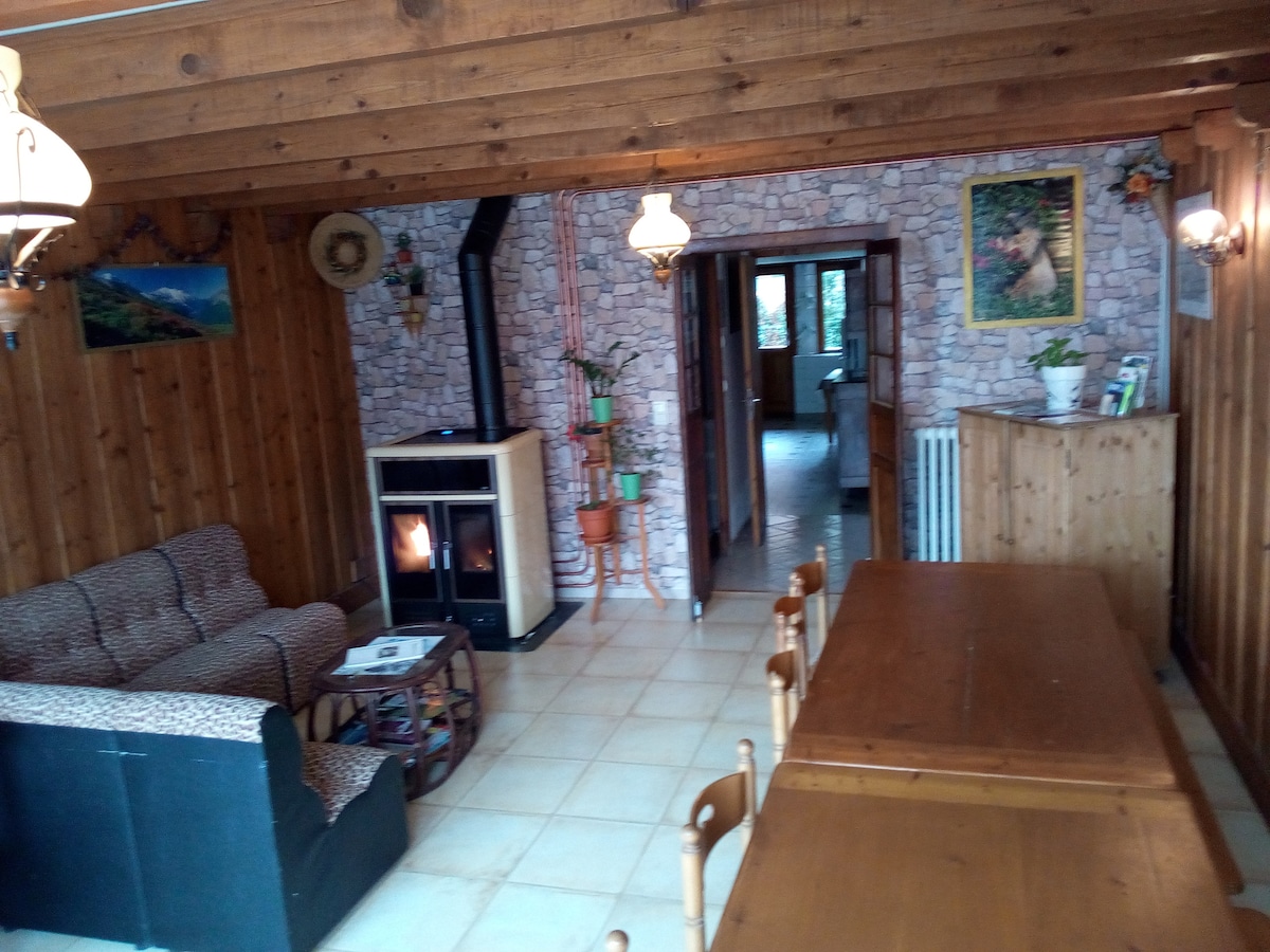 Notre Chalet Savoyard, beau et confortable, est entièrement équipé situé sur la commune de Larringes (haut d'Evian). Nous avons une chambre avec un lit double avec une belle décoration savoyarde et une mezzanine (hauteur maximale 1m90) avec 2 lits avec une décoration vintage parfaite pour les sportifs ou les familles avec enfants, pour eux ce sera une aventure, il y a des jeux, des livres. Notre Chalet est situé à 10 min de la station de ski Thollon. Nous avons deux chattes dans la maison.