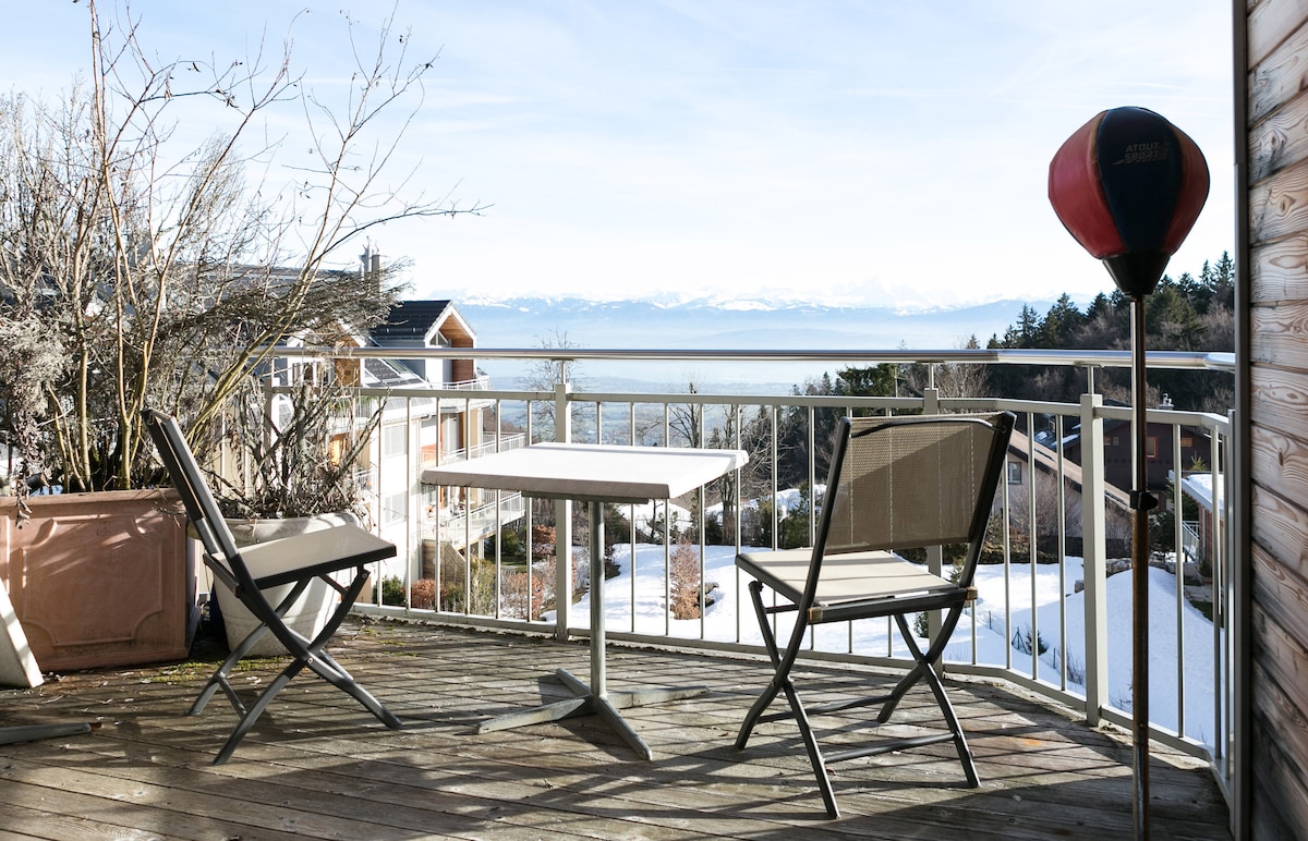 With the train station less than 50metres away from our home, St. Cergue is a fabulous location for walking, cycling, skiing or simply relaxing whilst surrounded by breathtaking views and fresh scented mountain/forest air. With Nyon 12mins and Geneva 30mins away by car, the location is superb. The flat is new and commands a position on the top floor thus guaranteeing the breathtaking views over lake Geneva and Mont Blanc. FREE CHARGING for electric cars in the underground parking facility!