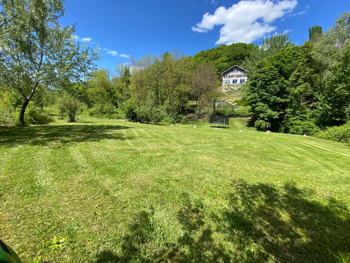 Villa de 240 m² nichée sur plus de 3000 m² en zone naturelle protégée, avec vue à couper le souffle sur rivière et forêt. À proximité de Genève et des stations de ski, notre villa offre un équilibre parfait entre nature et accès aux activités urbaines et de montagne. Détendez-vous dans le jacuzzi pendant que les enfants jouent dans la rivière, notre « piscine » naturel, ou observez la faune environnante. Profitez également d’une salle de jeux équipée pour des moments de partage inoubliable.
