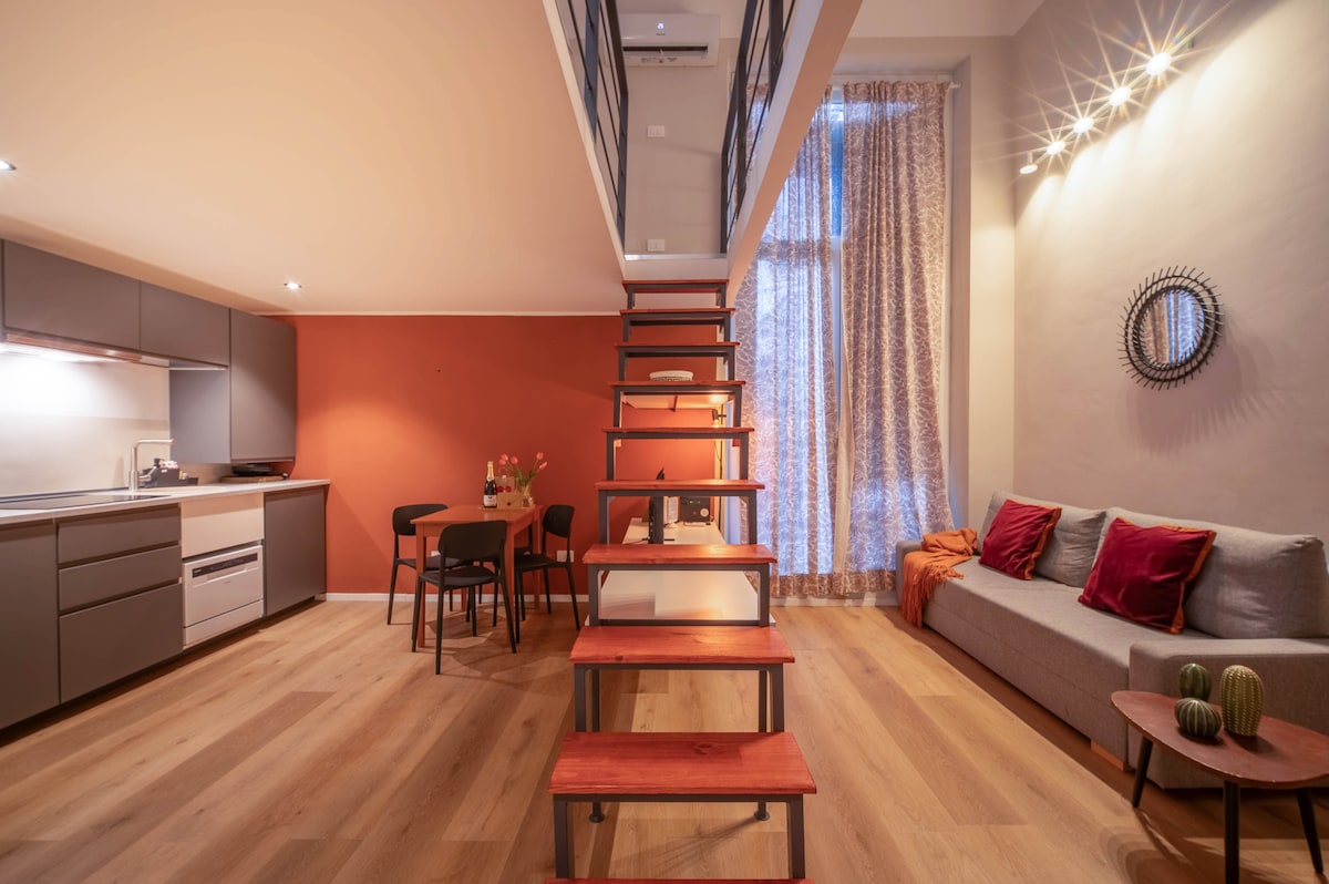 Appartamento imperiale dal design elegante con affreschi originali, le due maestose finestre offrono una vista spettacolare sul celebre Palazzo San Giorgio. L’appartamento si distingue per la sua raffinatezza e per il carattere unico dato dal soppalco, che ospita la zona notte. Le scale che conducono al soppalco sono adornate da affreschi storici ed antiche travi in legno a vista, immergendo l’ospite tra arte e storia.