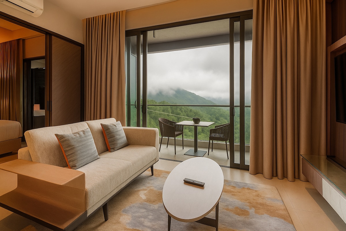 Welcome to Grand lon Delemen Hotel in Genting Highlands. This stylish unit features new interior design, beautiful artwork, stunning Mountain View from the 23rd Floor Balcony Enjoy cold, foggy weather with Free Parking, Coway water, Strong Wi-Fi, Netflix, Aircon, 1 Super King Bed, 1 Queen Bed & equipped Kitchenette. Nearby ; Hard Rock Cafe & Hoverland, Famous Buffets, Playgrounds, Pools & more !🎇 Just 4 km (9 mins) to Genting Sky Avenue & Casino—travel by shuttle or drive ✨