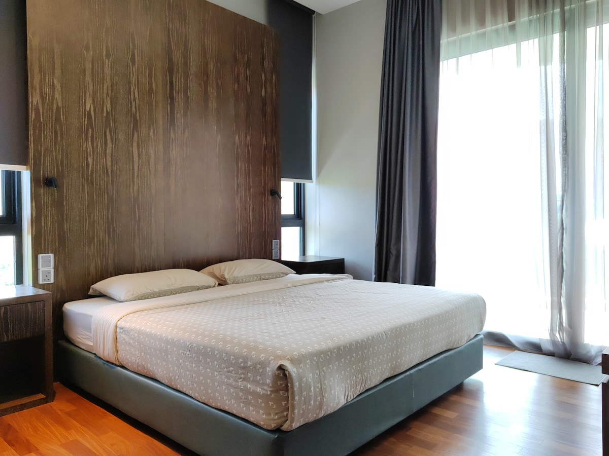 The Livingstone, ThatNicePlace, Selesa Hillhomes, Bukit Tinggi; a favourite unit with our guests. It is renovated, modern and cosy one-bedroom studio 500 sq. ft for 1-3 guests. It is on the ground level and offers easy access to lush greenery and fresh air. The bedroom (1Q) while a sofa bed in the living room is provided for the third guest. Much love has been poured into furnishing where you'll find rest, spirits revived and refreshed.