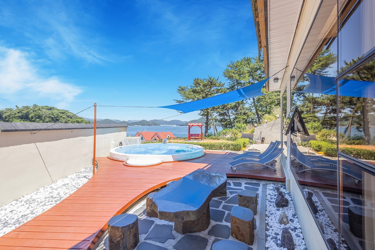 자연속에 둘러싸인 조용한 단체숙소로 아름다운 바다와 산을 함께 느낄 수 있는 곳. 대가족이나 단체모임등 조용히 힐링하기에 적합한 별장같은 숙소입니다. 오션뷰와 멋진석양을 마음껏 감상할수 있는 공간! 바베큐를 즐길 수 있으며 넓은 잔디 정원에서 수영장 물놀이, 트램폴린,모래놀이 등(수영장 7-8월 운영) 겨울에는 거실에서 벽난로,야외에서 불멍등 다양하게 즐길 수 있어요~ 아이들과 어른들이 같이 힐링하기에 적합한 감성숙소이며 재방문과 소개로 많이 방문하는 숙소입니다^^