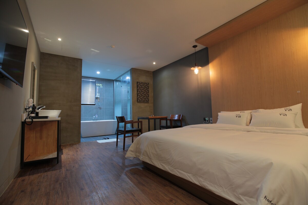 거제시 옥포동 중심에 위치 하고 있으며 1층 거실, 2층 침실 의 복층 구조로 층고가 높아 쾌적하고 편안한 숙박을 할 수 있는 뷰티크 호텔 입니다. 인근 대형마트 2곳이 있어 생활환경 과 접근성이 뛰어나고 거제시 인근 명소 주요 명소에서 가까우면서도 독특한 개성을 간직한 숙소입니다.