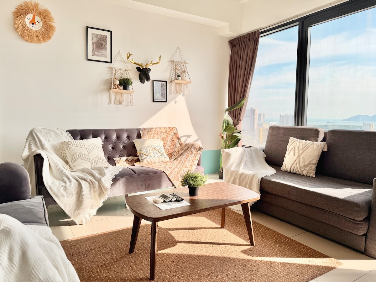 Maritime Suites by Comfy Penang • Unblocked ocean view • Sunrise view from the house • Penang Bridge view from the house • 5 stars SUPERHOST services • Next to seaside • 1000 square feet duplex • 1 private car park • 100 Mbps WiFi • 30 restaurants, cafes, pubs, Starbucks, Coffee Bean, Subway, 7-Eleven are at level 2 of our house • 5 to 8 minutes drive to Chew Jetty, Komtar & UNESCO Heritage old town.