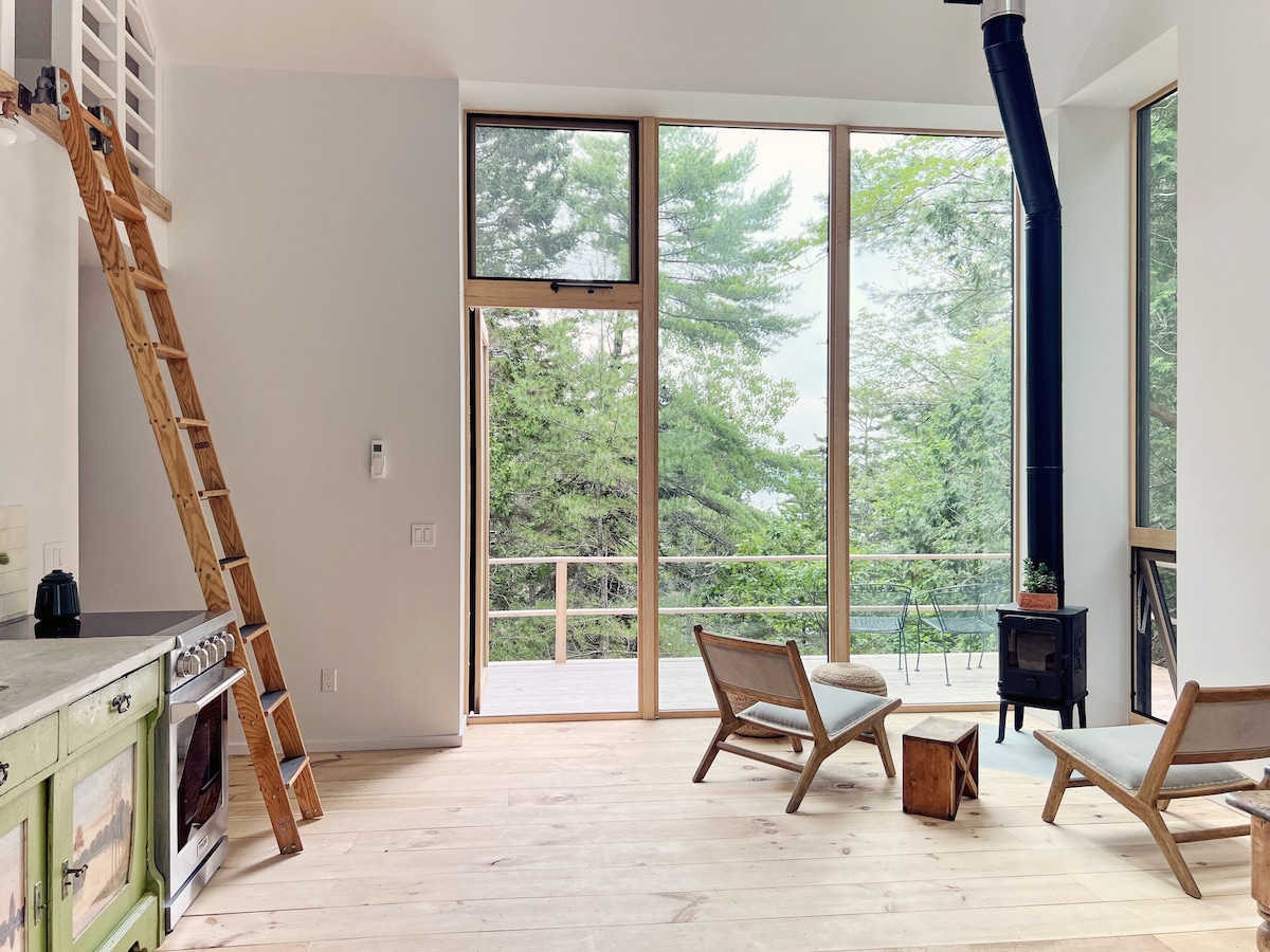 We built the Wren Cabin to be a serene space filled with light and art and with lots of cozy details. Lofted ceilings, a spiral staircase and large open concept with lofted bedroom. The cabin also has a gorgeous wood-fired sauna for those colder days. Wren cabin has a large wraparound deck for relaxing and an outdoor fire pit, as well as shared access to Adams Pond. The space is modern Scandinavian, light and aery, and filled with thoughtful details.