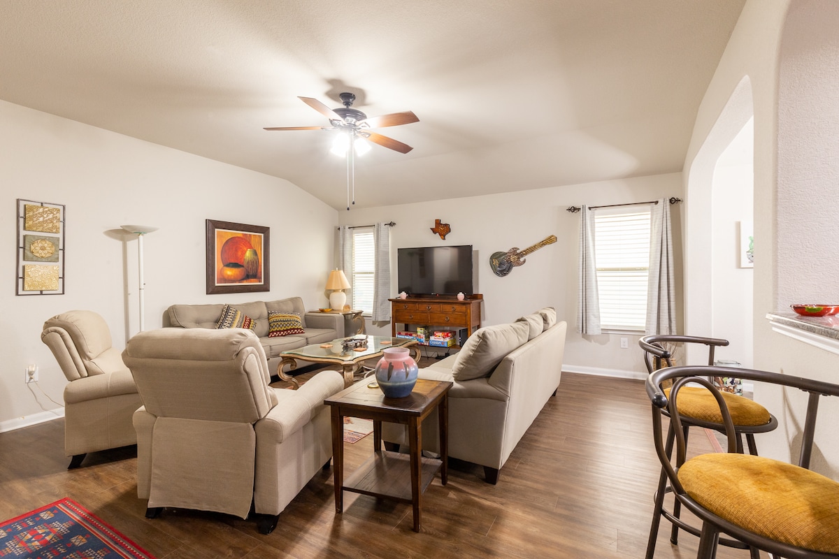 2600 sq ft home away from home. New carpet and flooring. 4 bed/3 bath with a bonus game room upstairs. All the bedrooms are downstairs. 3 tvs with cable and a 4th tv ready for you to attach your laptop to, keyless entry, patio grill and a foosball table. The kitchen has all the cooking tools for a big group. Black out curtains have been a guest favorite. It has beds for 8 but there is plenty of room for other guests . A quick 20 mile freeway ride to Austin and the events.