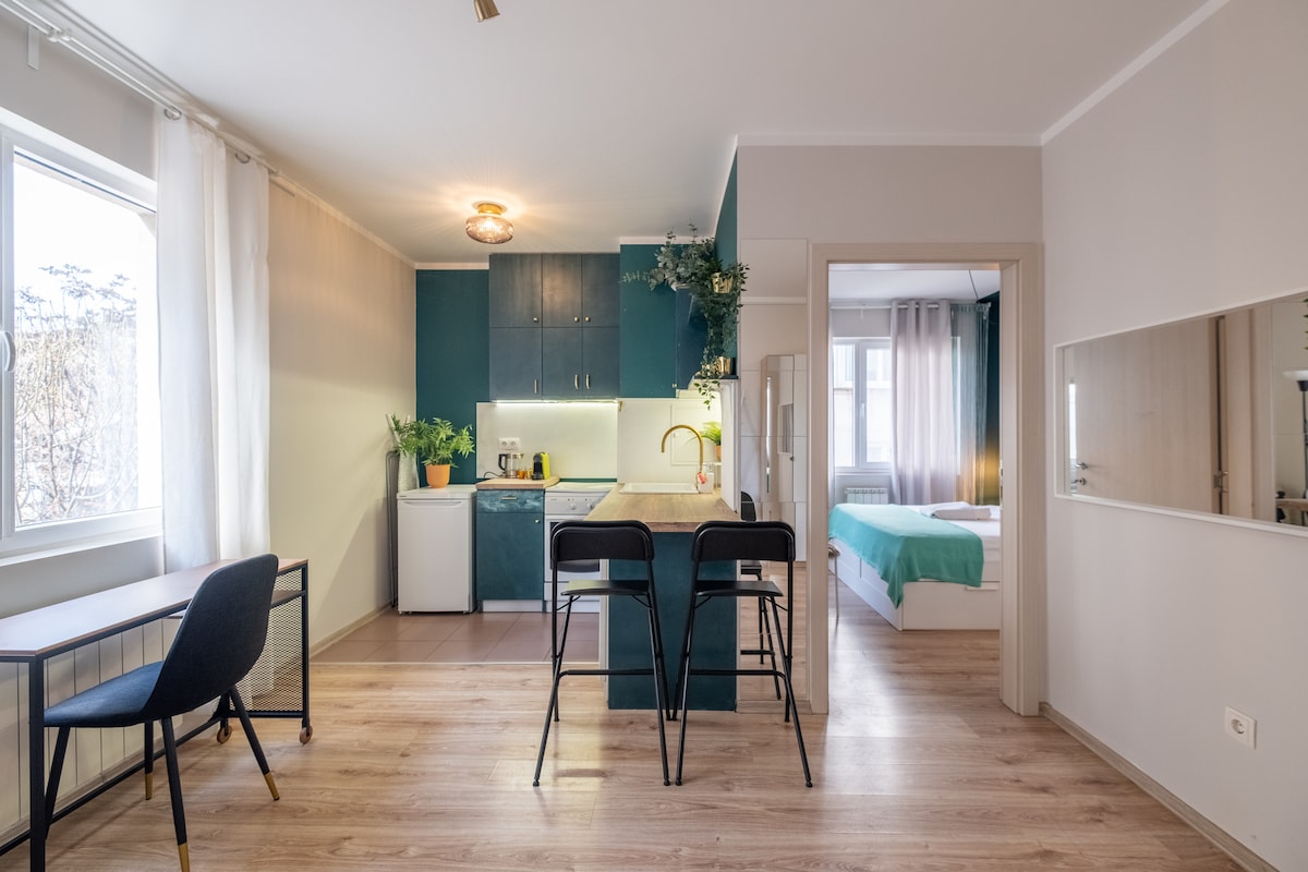 Welcome to my boutique attic studio at the foot of Vitosha. Bright, minimalist and peaceful space with beautiful mountain and city views. Located in a quiet, safe area—perfect for evening walks and relaxing away from the center. The bed features a Magniflex mattress and pillows for excellent rest. The studio has a fully equipped kitchen, fast Wi-Fi and a cozy work/dining area. Clean, calm and with easy access to both the mountain and the city.