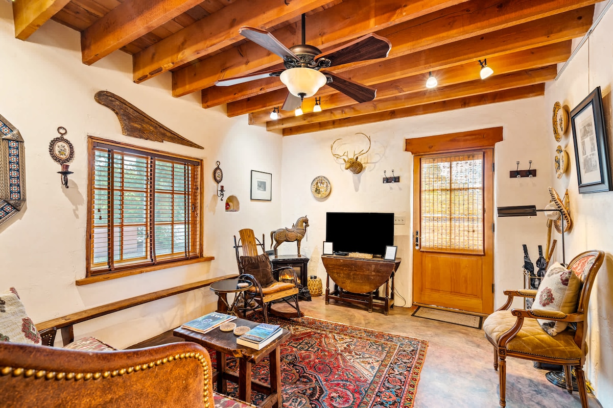 Soooo romantic! This nostalgic 1 BR/1 bath historic home is privately tucked away behind adobe walls on a quiet street just steps from downtown. Loaded with Santa Fe charm: viga ceilings, a seasonal kiva fireplace, full kitchen & beautiful private patio with a waterfall and koi pond. Walk to the Railyard, Plaza and gallery-filled Canyon Road. Pro-speed wifi and off-street parking keep your stay stress-free. Close to everything, while still quiet & private. Magic!
